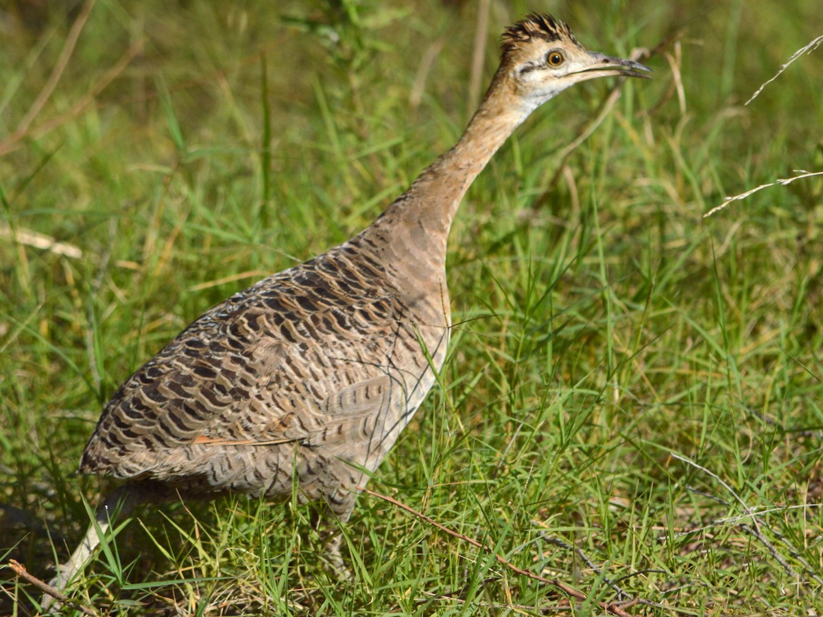 39–42 · 5 cm; macho 700–920 g, hembra 580–1040 g ( 1 ), uno sin sexo 1180 g ( 2 ). Tinamú grande con pico largo y curvado , cuello fulvioso o ante y espalda con un estampado atrevido.